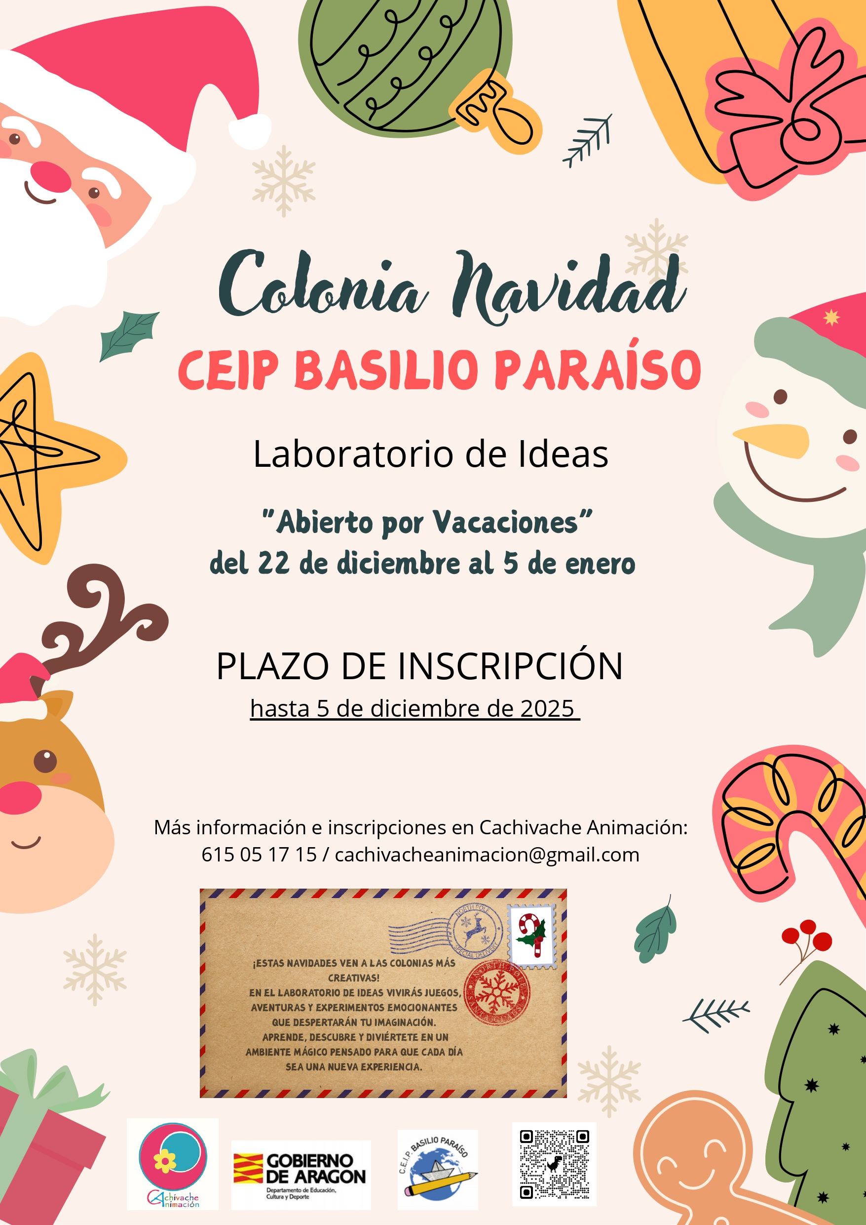 Inscríbete a las Colonias de Navidad del CEIP Basilio Paraíso gestionadas por el Cachivache Animación en el siguiente formulario INSCRIPCIONES Y +INFO AQUÍ